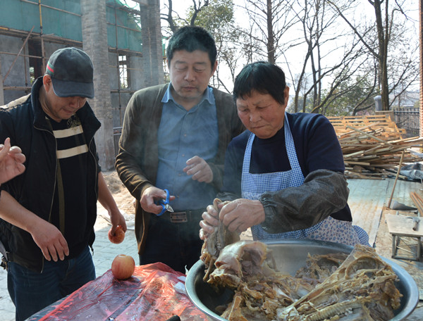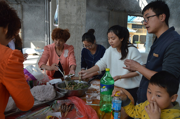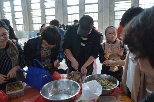 這邊包餃子的問(wèn)題正討論的激烈,那邊熱氣騰騰的豬頭也出鍋了?!把剑@么大的豬頭,小時(shí)候過(guò)年的感覺(jué)”?!皩?duì)啊,對(duì)啊,這種氣氛,這種味道,太有紀(jì)念意義了”。“來(lái)來(lái)來(lái),我拍張照片,微信朋友圈曬一曬”。黃色餃子、綠色餃子、紅色餃子、紫色餃子相繼的出鍋了,燒烤的食品也相繼出爐,大家互相品評(píng),因?yàn)槎际亲约簞?dòng)手參與,一切都變成了美食。